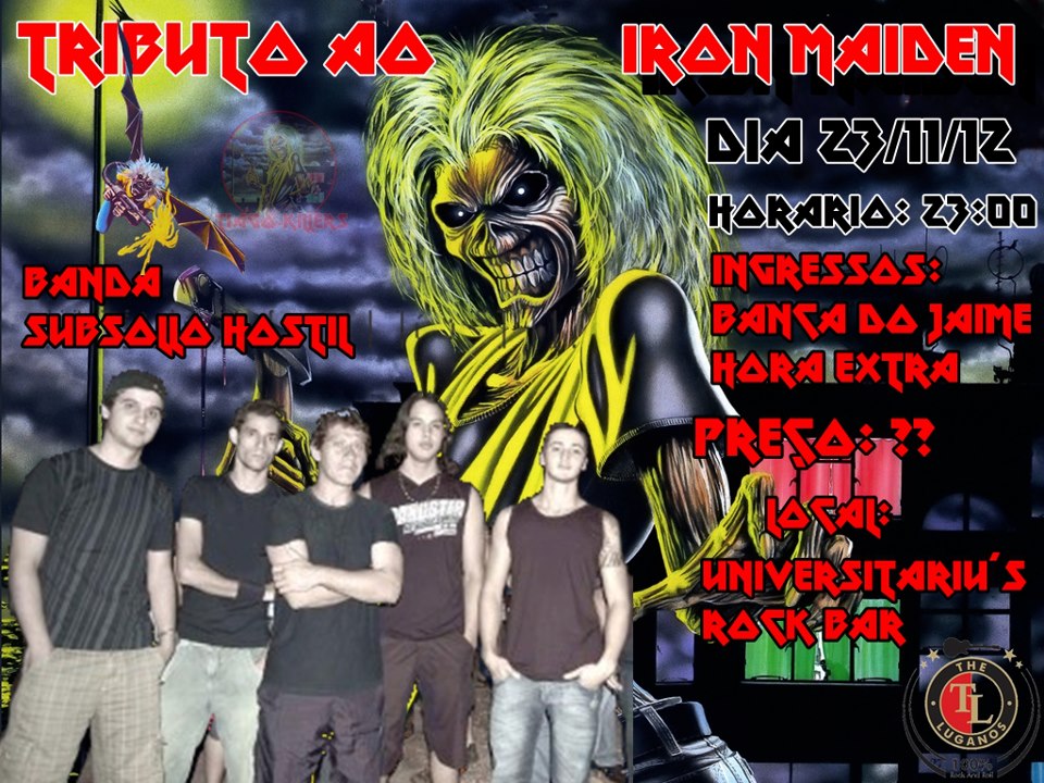A banda douradense de Heavy Metal Subsollo Hostil, formada em 2008, retorna aos palcos em grande estilo após um ano sem apresentações. No próximo dia 23, o grupo faz um tributo ao Iron Maiden; o show acontece a partir das 23 horas, no Universitáriu’s Rock Bar. Os ingressos podem ser adquiridos na Banca do Jaime e na conveniência Hora Extra, por R$ 10 cada.